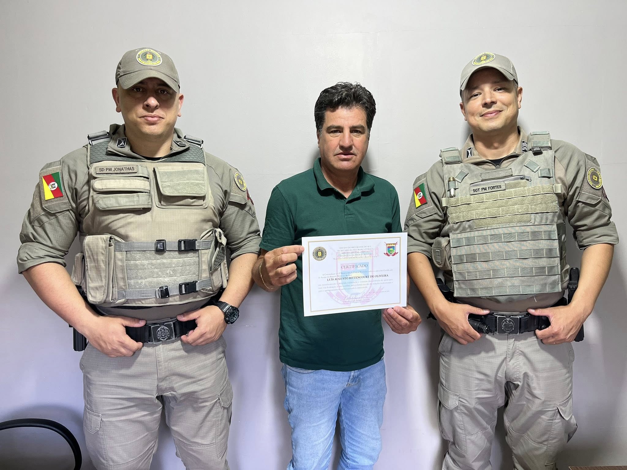 Na manhã de ontem, 02/12, o Presidente do Legislativo Municipal, Vereador Guto Bitencourt, recebeu do Comandante da Brigada Militar, Sargento Maurício Fortes, o Certificado de Amigo da Brigada Militar.